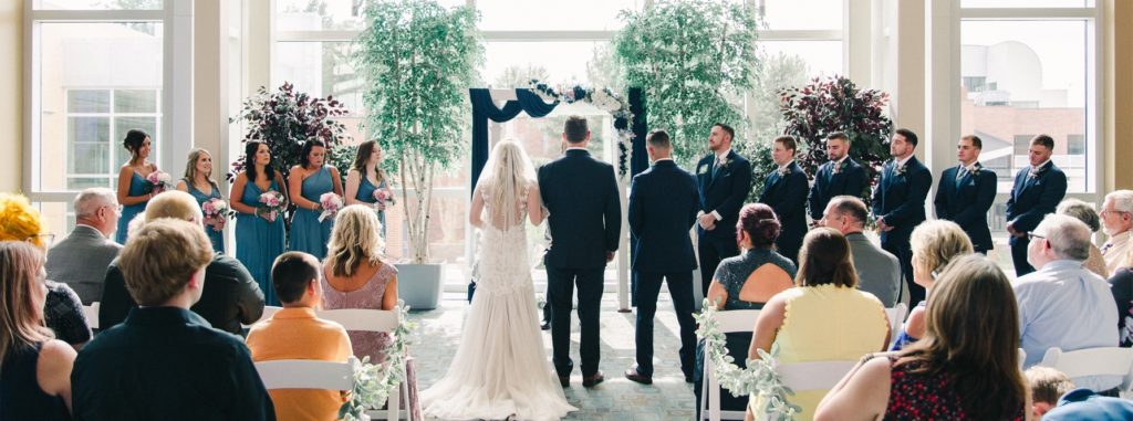 The NEW Center offers indoor and outdoor spaces to match your vision. You can have an elegant ceremony in the courtyard which flows into cocktail hour in our pre-function area, followed by a fun and exciting reception in The Grand Ballroom. Outdoor spaces are guaranteed to have an indoor backup in case of inclement weather. Bride and groom suites are included. See our event spaces
